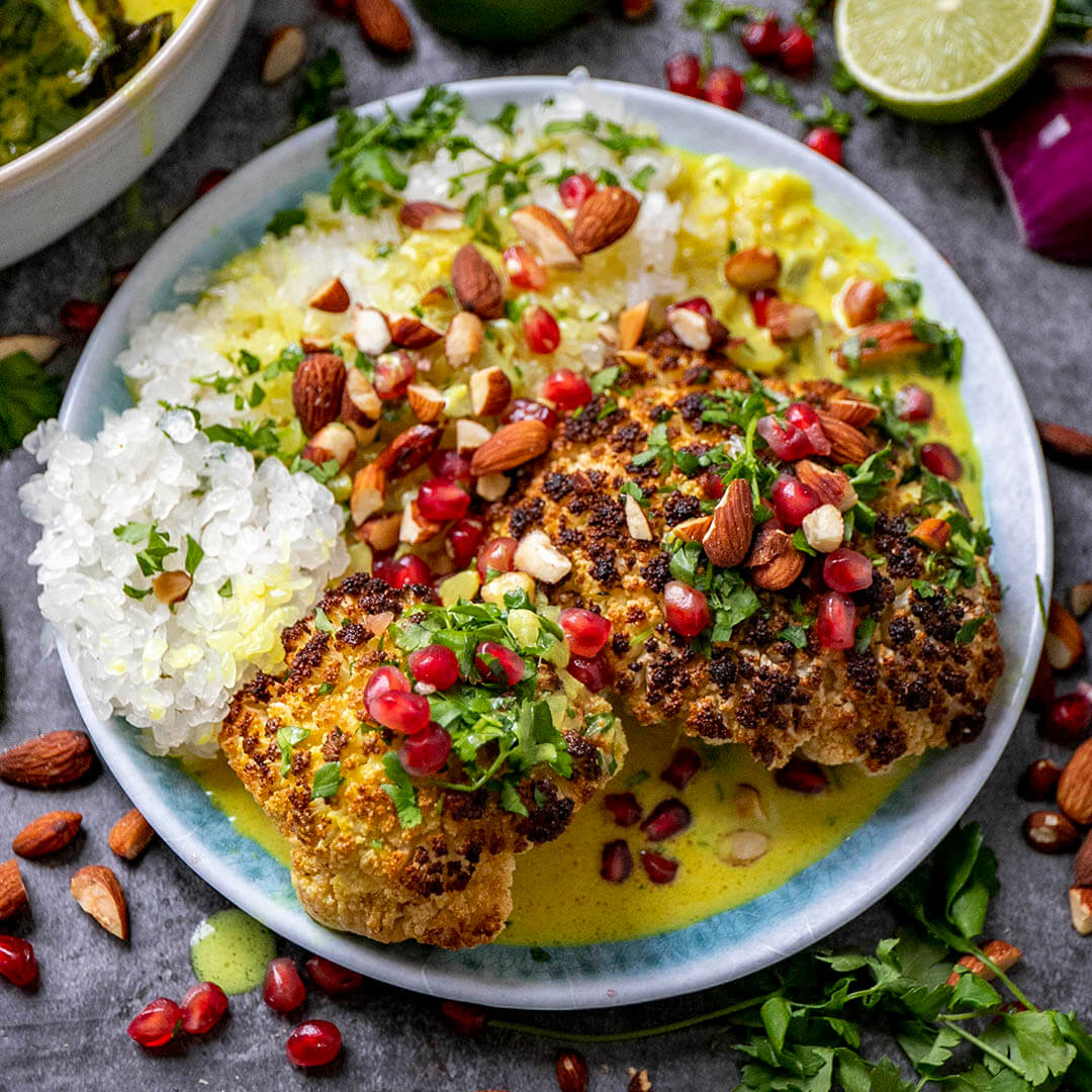 8. Wenn der Blumenkohl servierfertig ist, gib die gehackten Mandeln, Petersilie und optional Limettensaft und Granatäpfelkerne darüber.