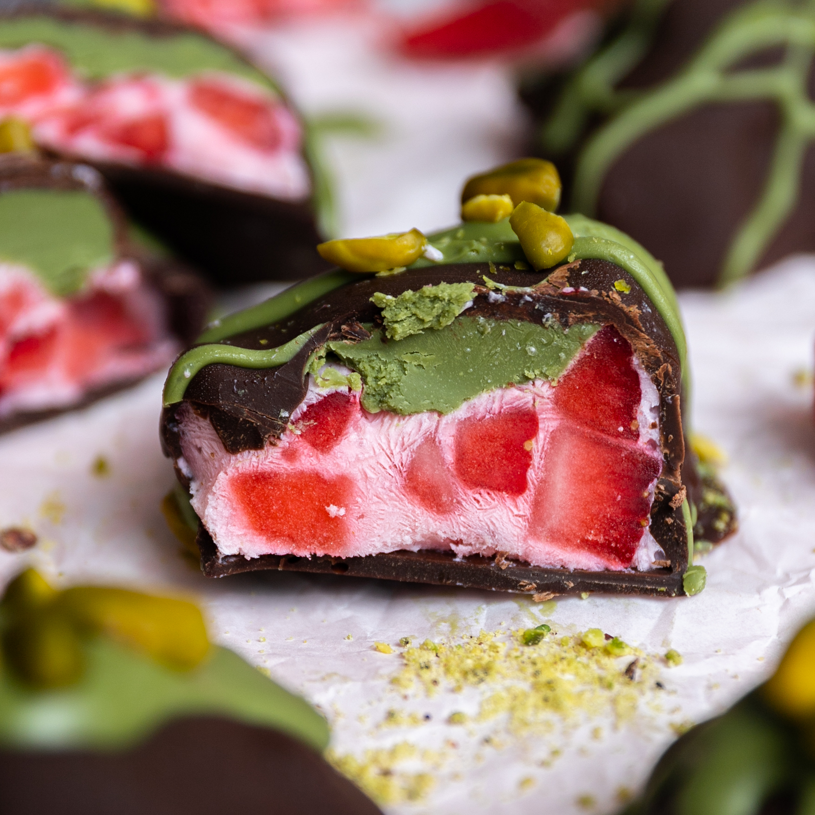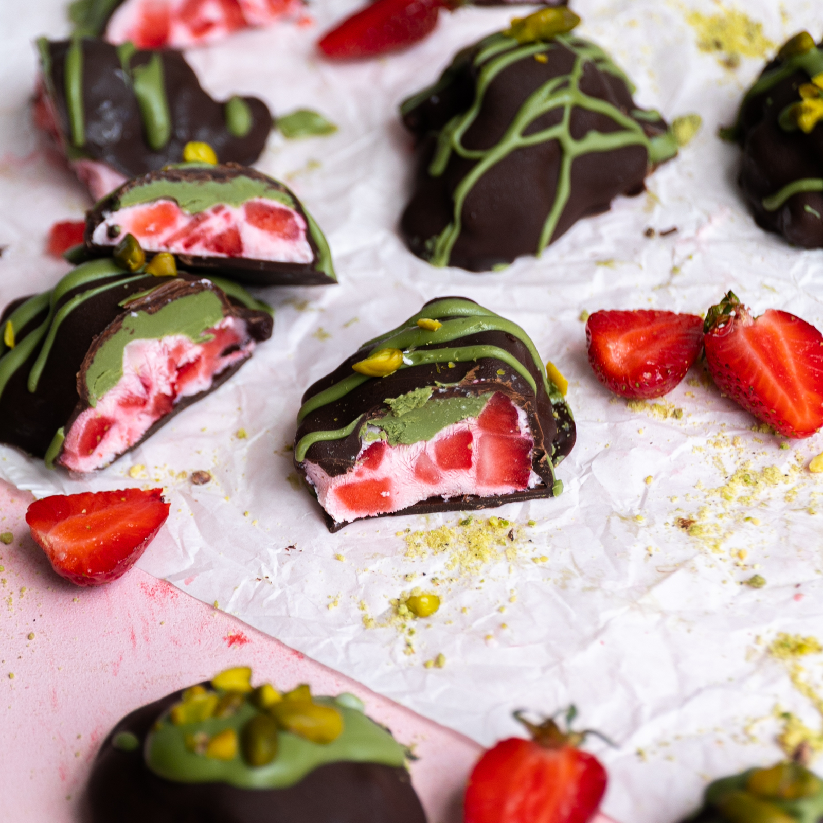 Die unwiderstehliche Süße der Erdbeeren, kombiniert mit der Cremigkeit des Yoghurts, der Extraportion Schokolade durch unsere zuckerfreien Edelbitter Schoko-Drops und dem speziellen Twist durch die Pistazien-Kokos-Creme, machen diese Snacks zu einem Must-Have für heiße Sommertage.