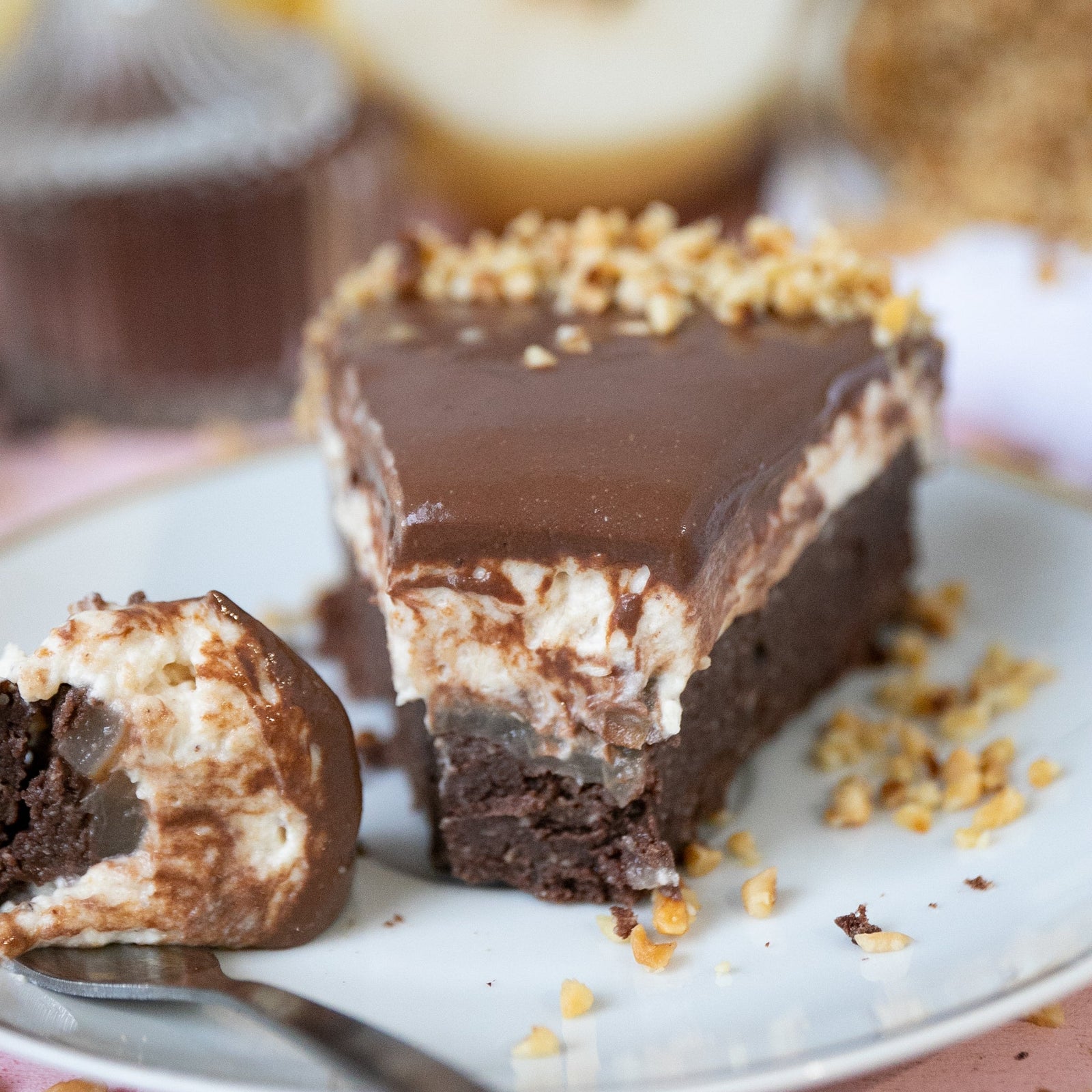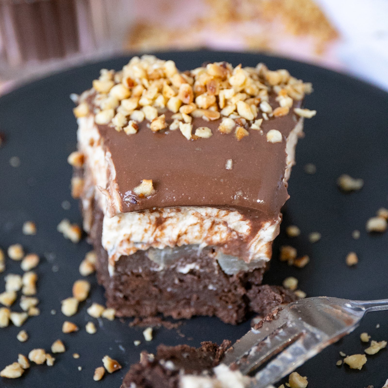 4. Verteile den Schokoguss über die Torte, verziere sie mit Haselnüssen und stelle sie bis zum Servieren kalt.