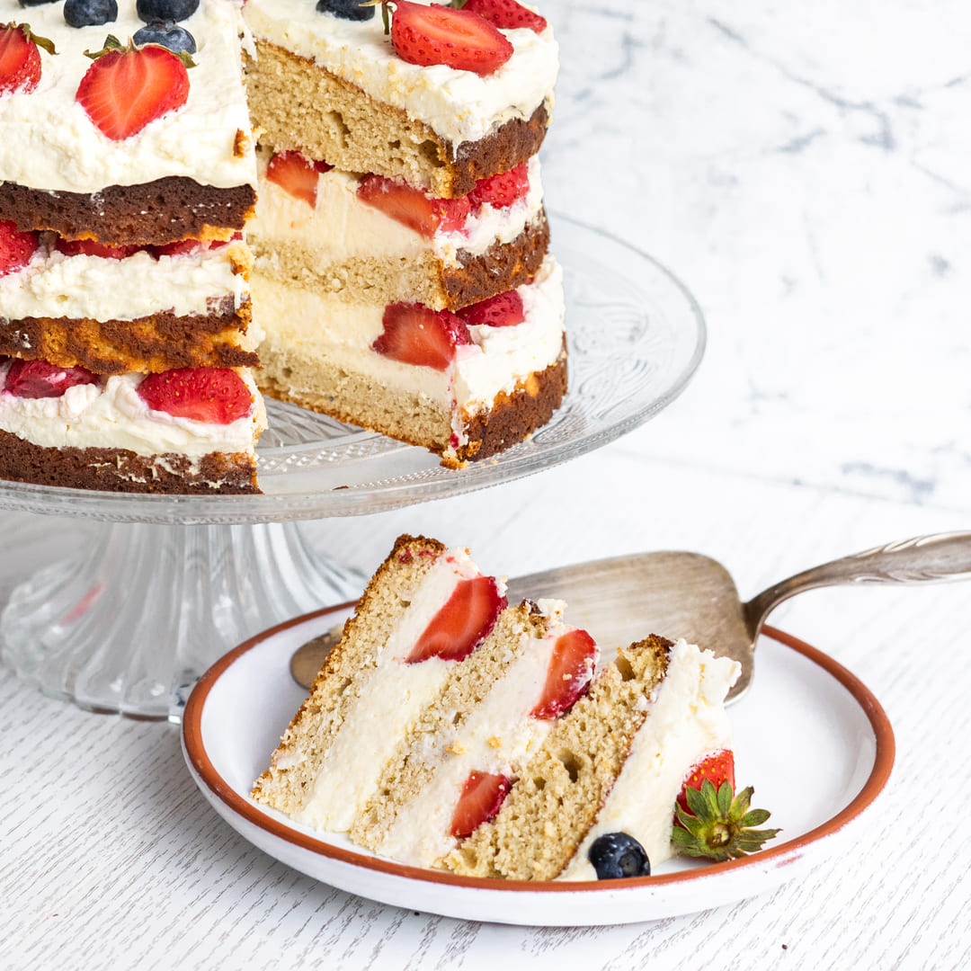 Diese Erdbeer-Schicht-Torte ist eine absolute Augenweide! Ein fluffig, leichter Kuchenboden aus unserer Kuchenglück Backmischung, die absolut glutenfrei ist und nur 3,2 g verwertbare Kohlenhydrate pro 100 g hat! Getoppt mit einer Sahne-Frischkäse Mischung und saftigen Beeren - ein Traum! Und tatsächlich kann man diese leckere Torte im Handumdrehen zaubern!