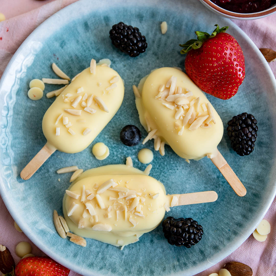 100 % Low-Carb, ketogen und ohne Zuckerzusatz wie sich versteht. Das Eis ist eine himmlische Kombination aus Mandelmus, Sahne und Vanille mit einem Kern aus fruchtiger Marmelade, überzogen mit leckerer, zuckerfreier weißer Schokolade!