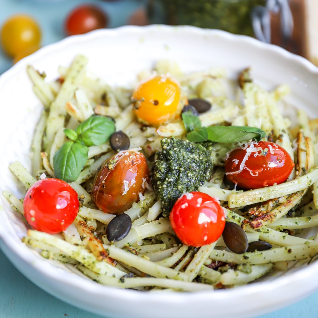 Dazu haben wir ein fixes Keto-Pesto gemixt, das aus Kürbiskernen, Parmesan, Olivenöl und Basilikum besteht - lecker!