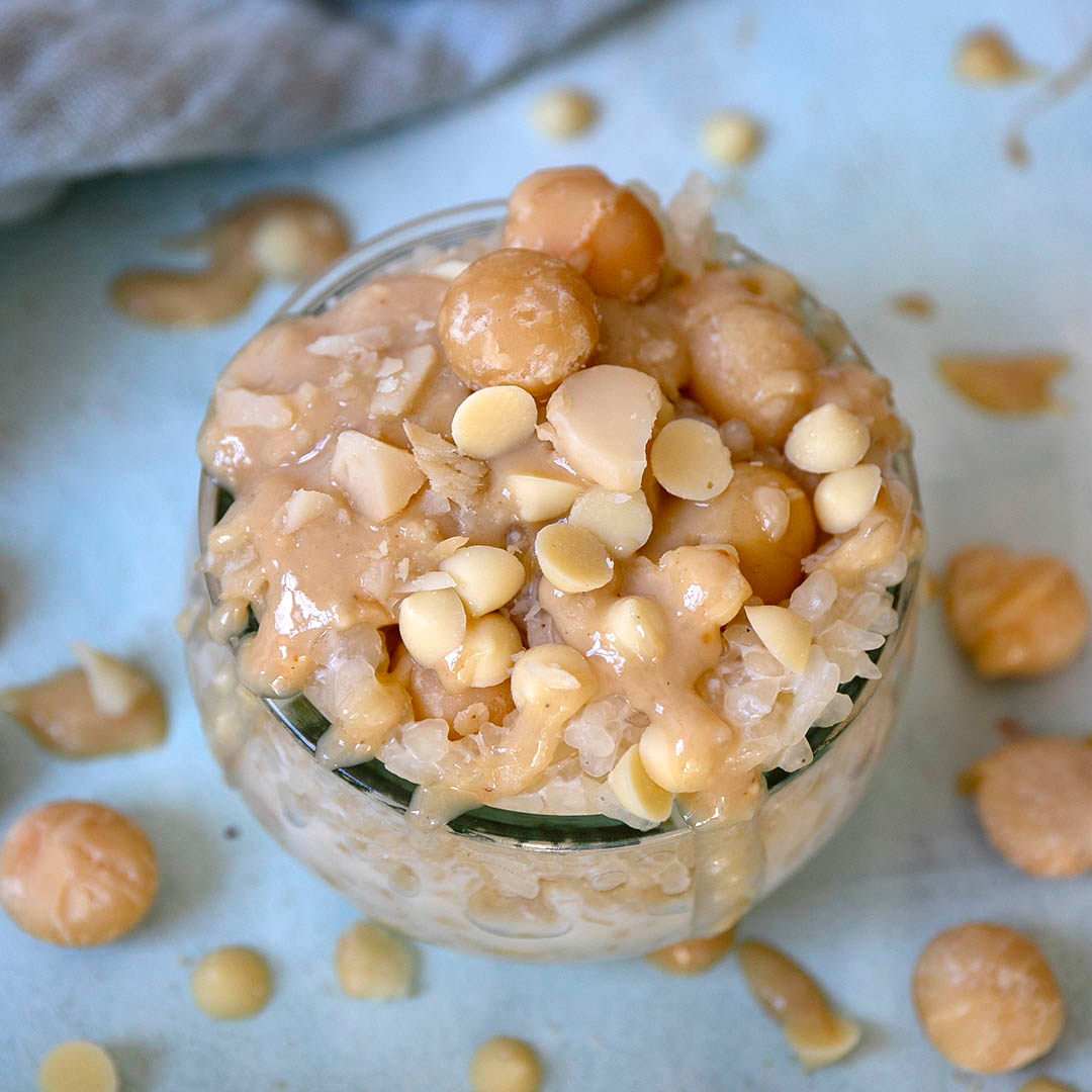 4. Fülle die Masse in kleine Gefäße und toppe den Milchreis wahlweise mit Macadamianüssen, Macadamiacreme und weißer zuckerfreier Schokolade.