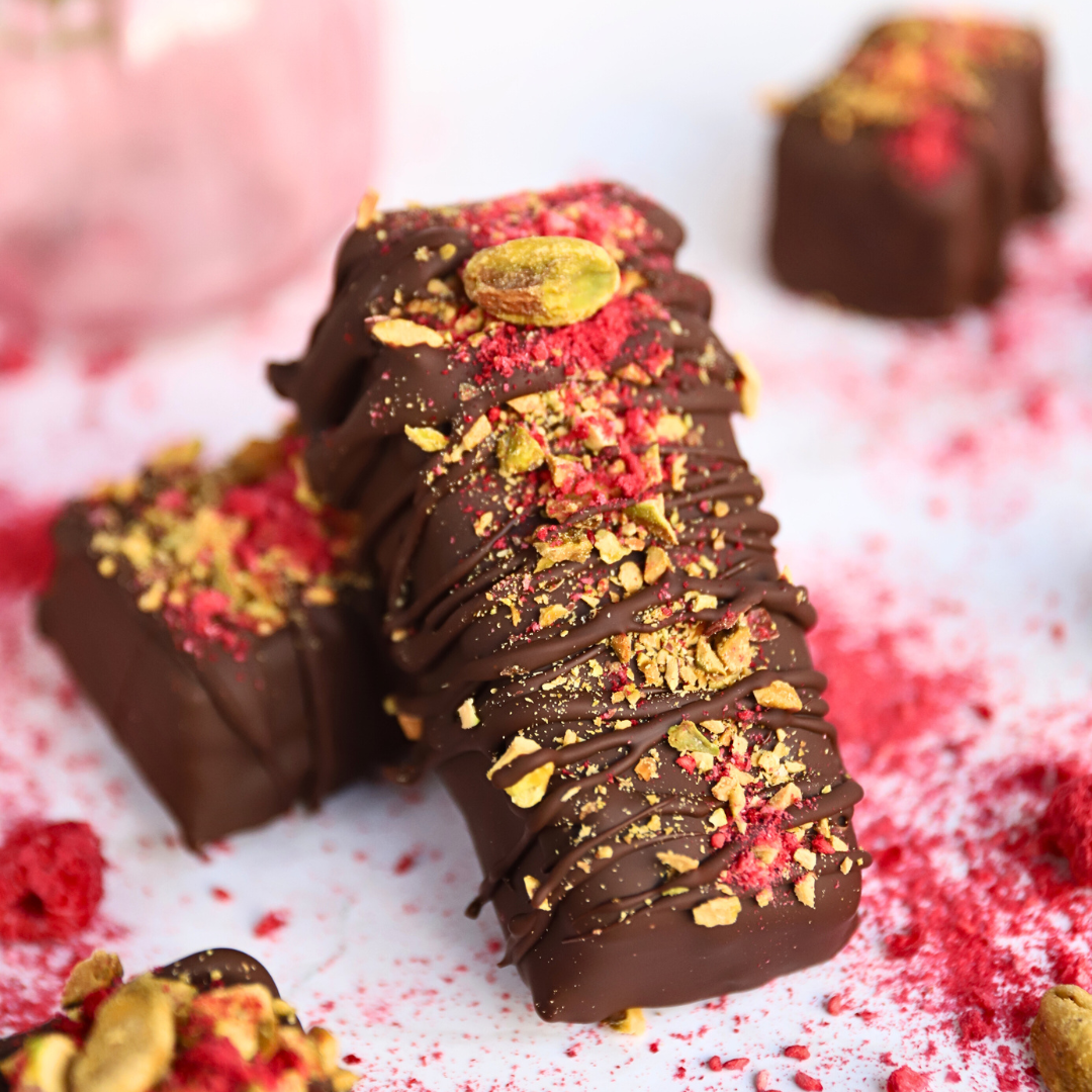 Knackig, cremig & unwiderstehlich! Diese Riegel sind ein echtes Geschmackserlebnis: Die samtige Pistaziencreme von Dalia Gourmet verleiht ihnen eine herrlich cremige Note, während die fruchtige Himbeer-Karamell-Schicht für einen aufregenden Kontrast sorgt. Umhüllt von knackiger Edelbitter-Schokolade und mit crunchy Pistazienkernen getoppt, entsteht ein perfektes Zusammenspiel aus süß, nussig und herb!