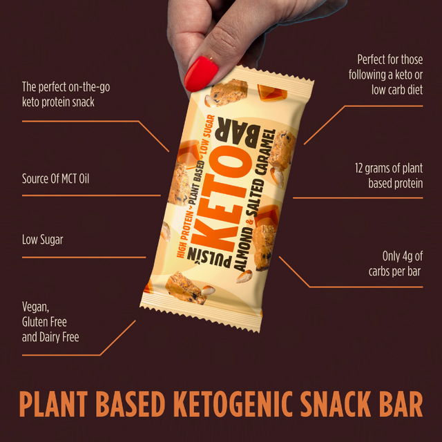 Was den Geschmack abrundet? Eine Kombination aus Erdnussbutter, Schokoladenstückchen mit 72 % Kakaoanteil und MCT-Öl für den extra Energieschub – und das alles 100 % vegan. Die Pulsin Bar mit Mandel und Salted Caramel beweist, dass bewusste Ernährung richtig lecker sein kann. Und mit gerade einmal 8,5 g Kohlenhydraten pro Riegel bleibst du ganz easy im Keto-Modus.