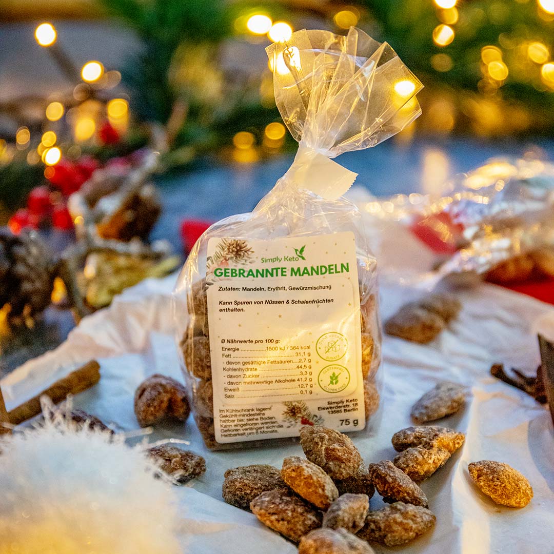 Unsere gebrannten Mandeln liefern dir das volle Aroma – nur eben ohne Zuckerzusatz und ideal für deine Keto-/Lower-Carb*-Ernährung. Würzig-süß, knusprig, winterlich – einfach zum Verlieben. ✨